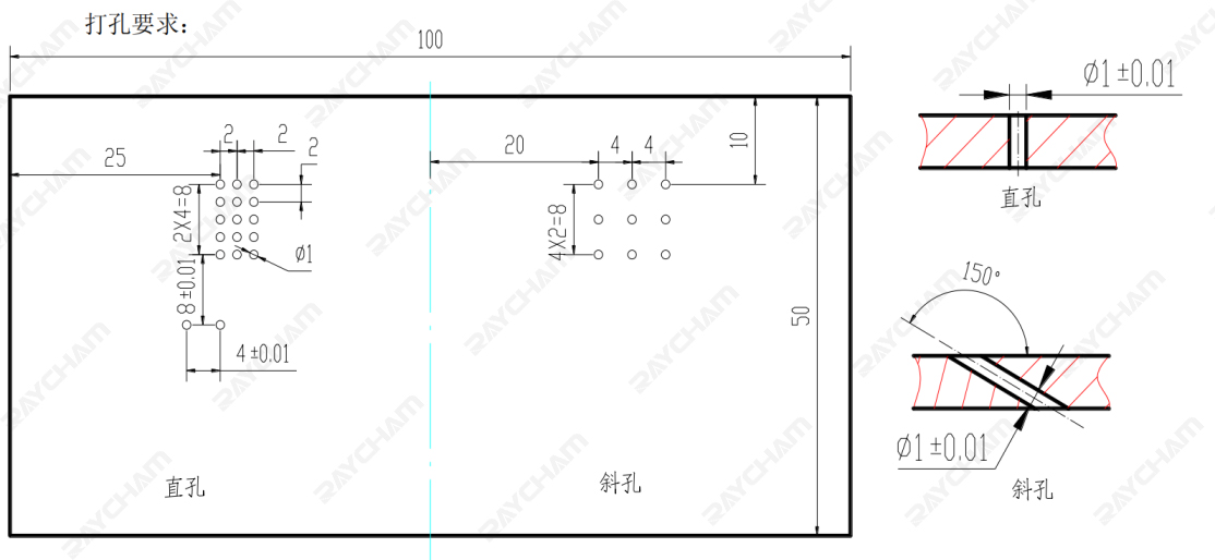 斜孔:共計(jì) 9 個(gè),孔徑均按 1±0.01mm 控制。斜度及方向按上圖要求。
