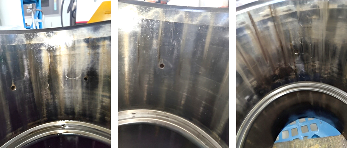中科煜宸優(yōu)選滿足工藝要求的合金粉末用于行星架軸徑工作面激光熔覆。對(duì)于尺寸缺失較多的行星架,采取層間冷卻多次熔覆方式嚴(yán)格控制質(zhì)量缺陷以滿足熔覆層尺寸要求,外觀及探傷檢測(cè)無(wú)裂紋、夾雜、氣孔、未熔合等缺陷。