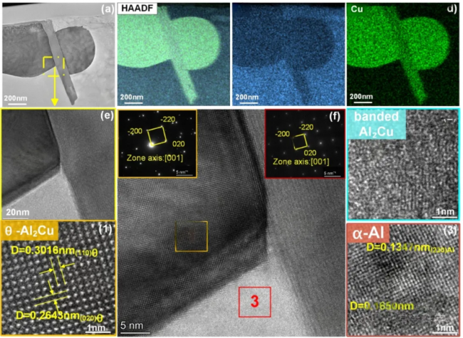 圖10 透射電子顯微鏡(TEM)觀察到的試樣顯微組織:(a-d) θ相的形貌及化學(xué)成分;(e) 界面放大圖;(f) α-Al與Al?Cu相界面的高分辨透射電子顯微鏡(HRTEM)圖像,插圖為θ相的快速傅里葉變換(FFT)和選區(qū)電子衍射(SAD)圖譜