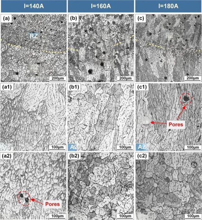 圖8 不同電弧電流下沉積件的典型顯微組織光學(xué)顯微鏡觀察結(jié)果,(a-a2) I=140A;(b-b2) I=160A;(c-c2) I=180A