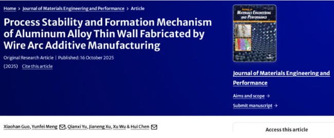 2025年10月16日,西南交通大學(xué)材料科學(xué)與工程學(xué)院的研究團隊在《Journal of Materials Engineering and Performance》期刊發(fā)表最新研究文章“Process Stability and Formation Mechanism of Aluminum Alloy Thin Wall Fabricated by Wire Arc Additive Manufacturing”,研究了電弧電流對2319鋁合金薄壁件電弧增材制造(WAAM)的工藝穩(wěn)定性、形成機理及力學(xué)性能的影響,確定了最優(yōu)電弧電流參數(shù)。本期谷·專欄將對該研究成果進行簡要分享。