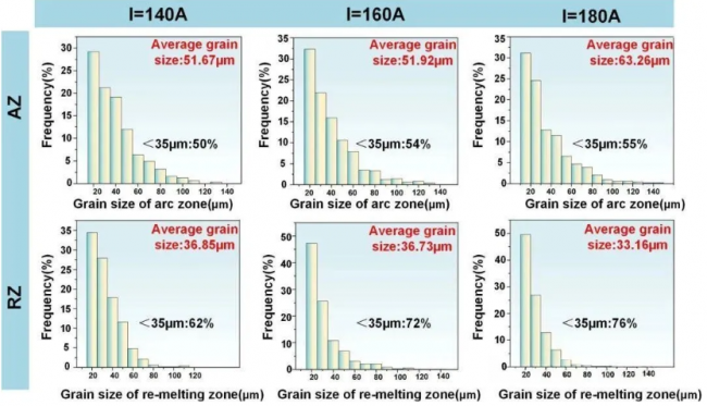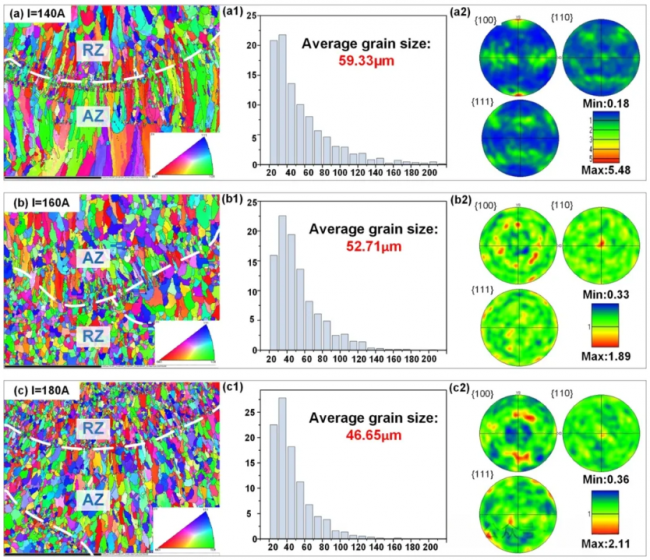 (3)隨著電弧電流增大,熱輸入增加,導(dǎo)致電弧熔化區(qū)(AZ)晶粒尺寸增大,而重熔區(qū)(RZ)晶粒細化。較高的電流促進晶粒細化、柱狀晶向等軸晶轉(zhuǎn)變,并降低晶粒取向集中度,表明等軸晶形成能力增強。