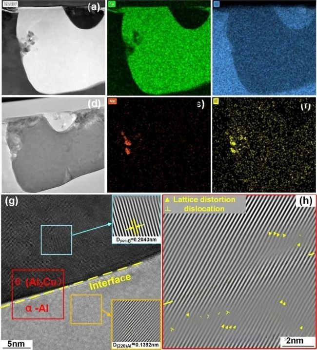 圖11 透射電子顯微鏡(TEM)觀察到的試樣顯微組織:(a-f) θ相的形貌及化學(xué)成分;(g-h) 對應(yīng)Al?Cu相界面高分辨透射電子顯微鏡(HRTEM)圖像的逆快速傅里葉變換(IFFT)重構(gòu)圖