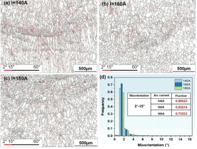 圖14 低角度晶界(LAGBs)和高角度晶界(HAGBs)的分布情況,(a) I=140A;(b) I=160A;(c) I=180A;(d) 低角度晶界統(tǒng)計結(jié)果