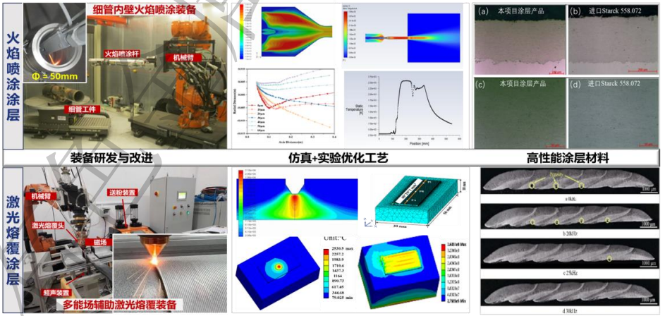 · 專用涂層工藝與裝備:開發(fā)窄徑管(≤50mm)內(nèi)壁超音速火焰噴涂技術(shù)與裝備;研制多能場(chǎng)輔助激光熔覆系統(tǒng),攻克大幅面涂層易開裂難題;結(jié)合有限元模擬多場(chǎng)耦合仿真技術(shù),實(shí)現(xiàn)了高致密度(≥99%)、高硬度(≥1200HV)、高結(jié)合力(≥580MPa)的含鎢及鎢基涂層工藝的全流程優(yōu)化。