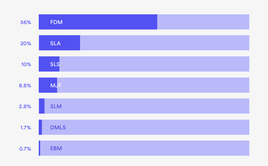 不出所料,F(xiàn)DM(熔融沉積成型)仍然是參與調(diào)查的人最常見(jiàn)的選擇,有56%的人表示這是他們最常用的增材制造方法。此外,后處理選項(xiàng)的進(jìn)步正在幫助推動(dòng)3D打印的采用。