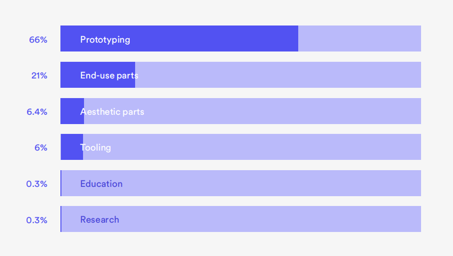 原型制作在全面生產(chǎn)之前開(kāi)發(fā)樣品產(chǎn)品以評(píng)估設(shè)計(jì)和功能是3D打印的第一個(gè)真正用途,并且仍然占很大份額。66%的受訪者將其列為3D打印的主要用途。其他關(guān)鍵應(yīng)用包括加工、小批量生產(chǎn)、大規(guī)模定制和批量生產(chǎn)。
