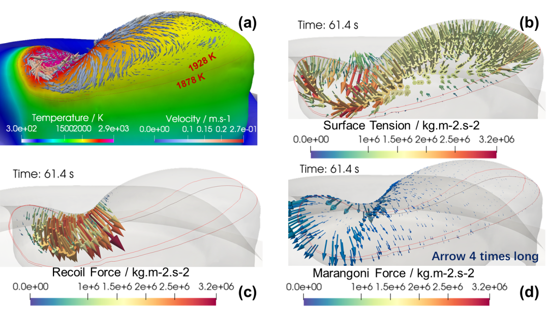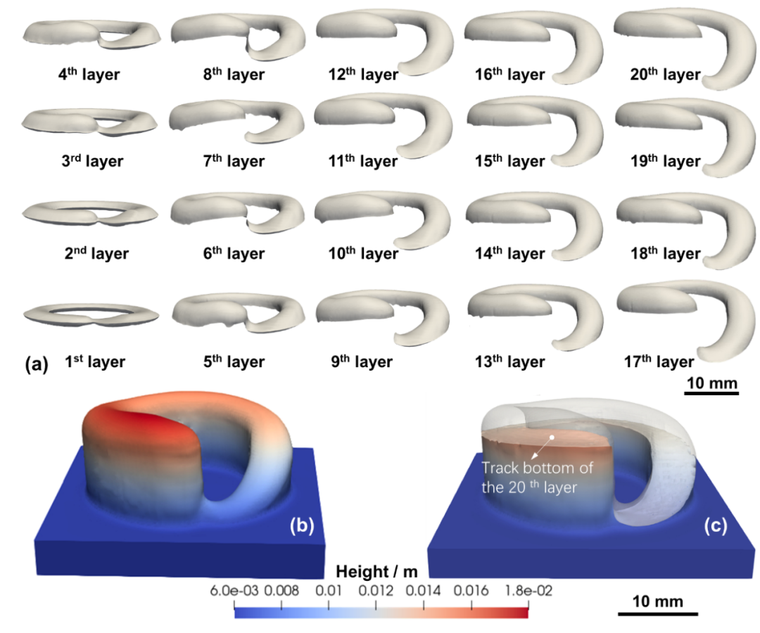 該研究揭示了激光增材制造過程中熔池內(nèi)部作用力對(duì)沉積偏差的影響機(jī)制,在介觀尺度探明了蒸汽反沖壓力、表面張力、熱毛細(xì)力在不同傳熱條件下對(duì)熔池形態(tài)的具體作用,繼而闡明了封閉路徑結(jié)構(gòu)在掃描路徑處產(chǎn)生偏差的根本原因。